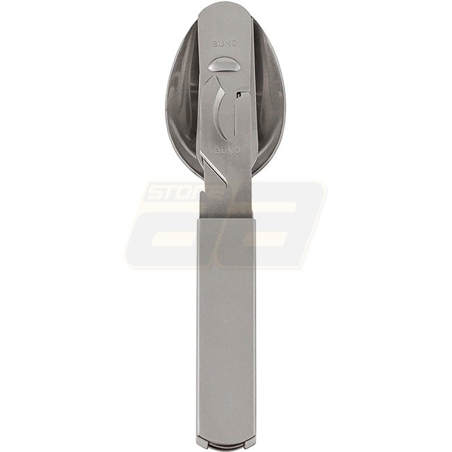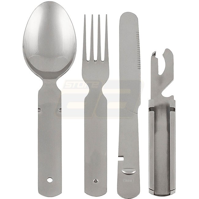 MFH BW Cutlery Set Heavy Version: Knife, fork, spoon, can-/bottle opener. Length: 19cm. Weight: 200g. 100% Stainless Steel.