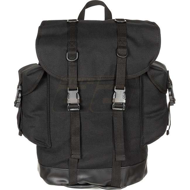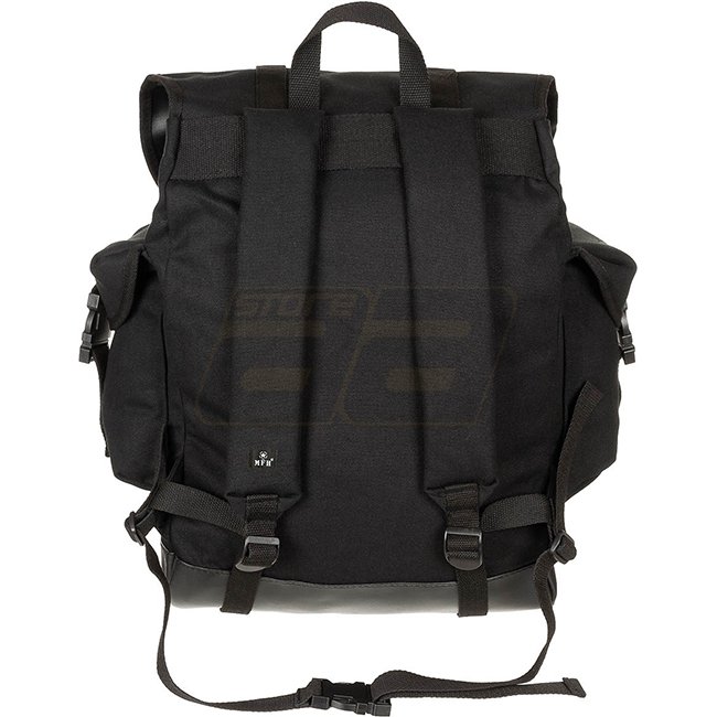 MFH BW Mountain Backpack New Model - Black: Adjustable, padded shoulder straps, detachable waist strap, top carrying handle, main compartment with drawstring, side pockets with flap and compartments, lid with D-rings and closures. Capacity 30L. Dimensions