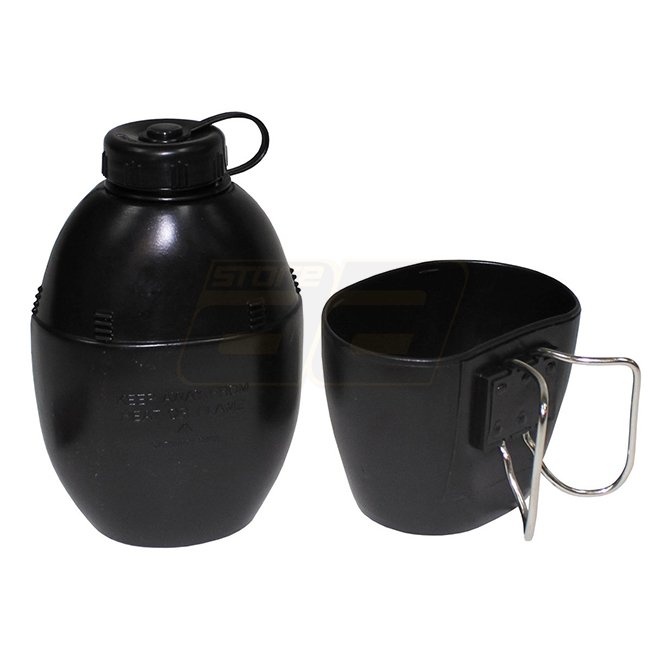 British version of canteen cup with chromed steel handle, screw cap, and 850ml capacity.