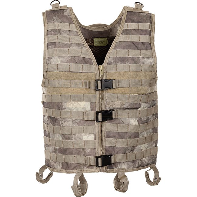 MFH MOLLE Vest Light - HDT Camo: Tactical vest with modular system, durable front zip, adjustable shoulder, Molle attachment loops, velcro panels, rescue handle, net pockets. Material: 100% Polyester.
