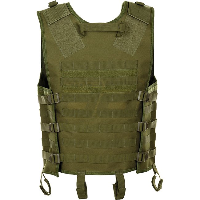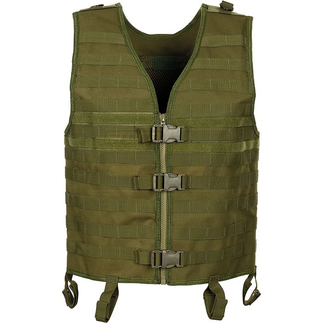 Tactical vest with modular system, featuring durable front zip with clip closure. Height adjustable on the shoulder by velcro and metal D-Ring. Molle attachment loops all over the vest, with velcro panels on chest and back. Includes rescue handle on the b