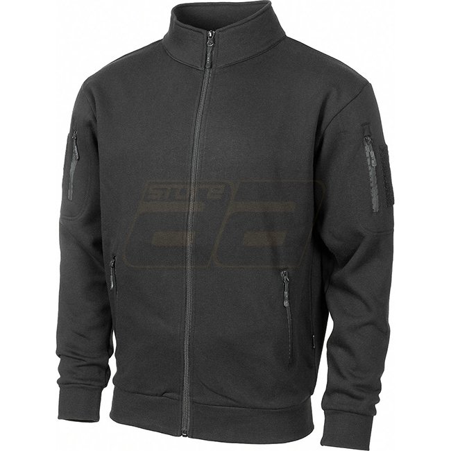 Stay warm and stylish with the black MFH Tactical Sweatjacket in 4XL size. Features front zip, knitted cuffs, stand-up collar, 2 hip pockets, 2 upper arm pockets with headphone port, and attached Velcro panels. Made of 60% cotton and 40% polyester.