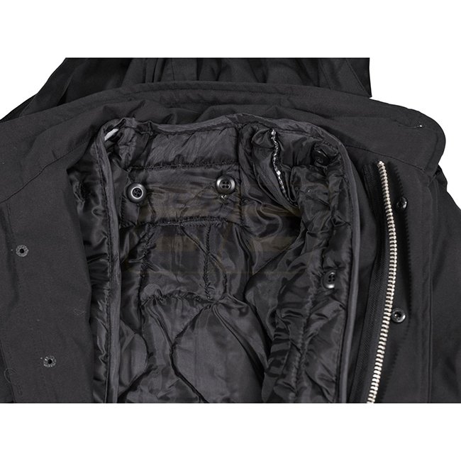 MFH US Field Jacket M65 Lined - Black - 2XL: Cotton lined with detachable quilted lining, durable zip with button placket, multiple pockets, integrated hood, adjustable sleeve ends and waist drawstring. Material: 65% Polyester, 35% Cotton outer, 100% Cott