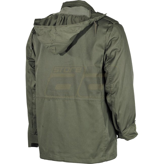 MFH US Field Jacket M65 - Olive - 4XL. Cotton lining, zip with button placket, 4 pockets, hood with drawstring and more. Durable and adjustable. Material: 65% Polyester, 35% Cotton.