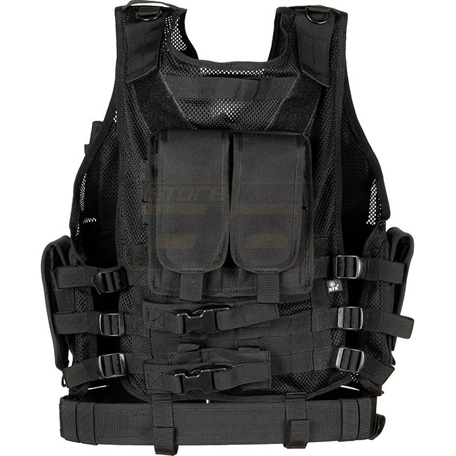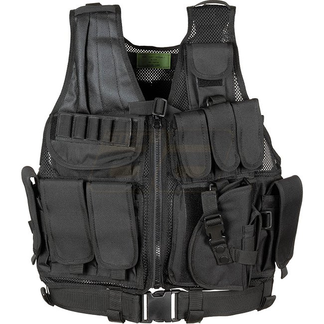 MFH USMC Vest & Belt - Black: Mesh base material, adjustable size, multiple pockets, removable pouches, Molle attachment loops, holster with ammo pouch, plastic belt fastening. 100% Polyester.