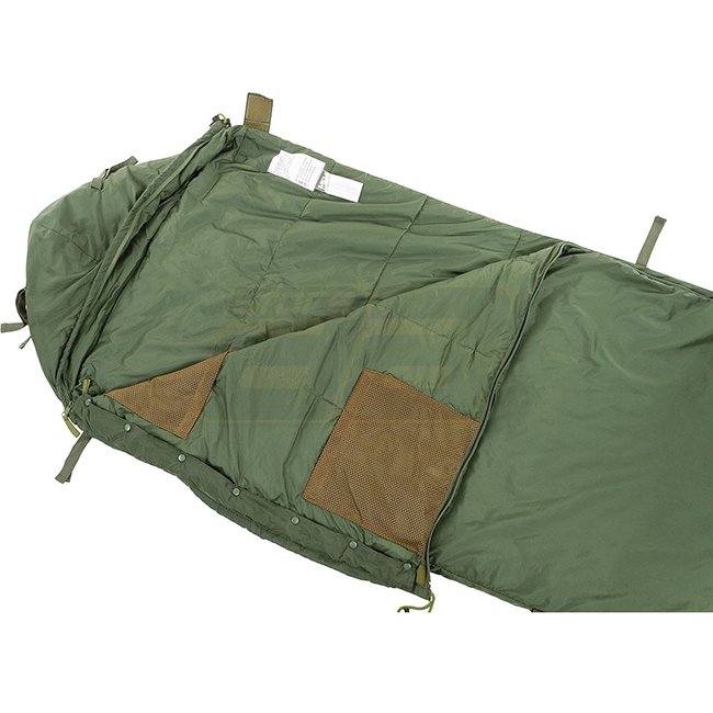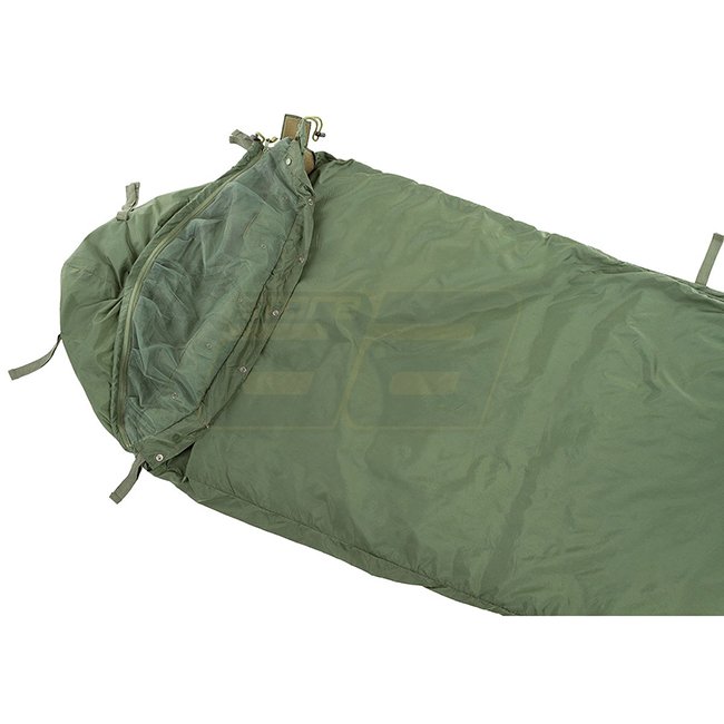 HighDefence GB Sleeping Bag in Olive - light weight, modular design with rollable mosquito net, hood-shaped head part, mesh pockets, adjustable shoulder area, and full-length zip. Versatile product suitable for various outdoor activities. Dimensions: 235