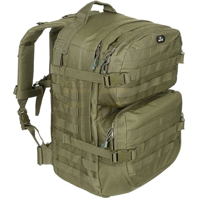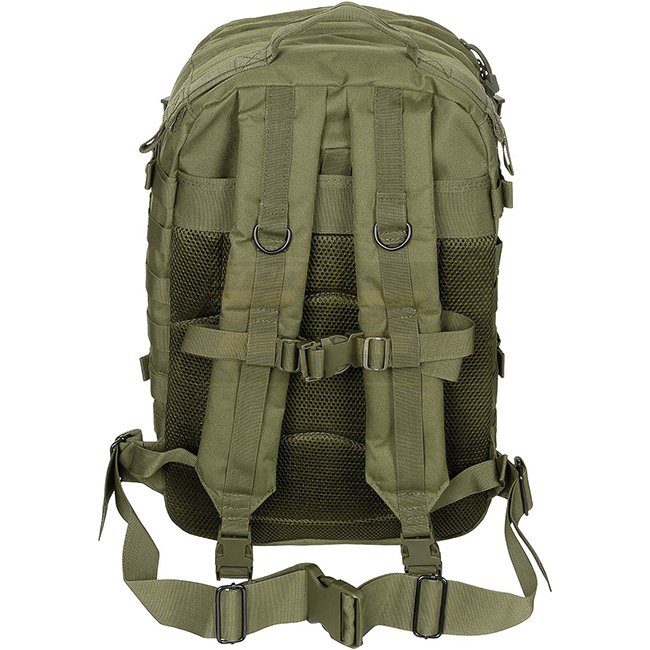 Adjustable, padded shoulder straps with metal D-rings adjustable, detachable chest- and waist straps padded back part made of breathable mesh material and a large slide-in compartment with velcro for hydration pack 1 top carrying handle with 2 lateral, concealed openings for access to the main compartment main compartment with 2-way zip and small mesh pocket with zip 2 front pockets with 2-way zip 2 compressions straps on each side various front, lateral and bottom Molle attachment loops Capacity: ca. 40 l Dimensions: ca. 30 x 48 x 27 cm (W x H x D) Weight: ca. 1,25 kg