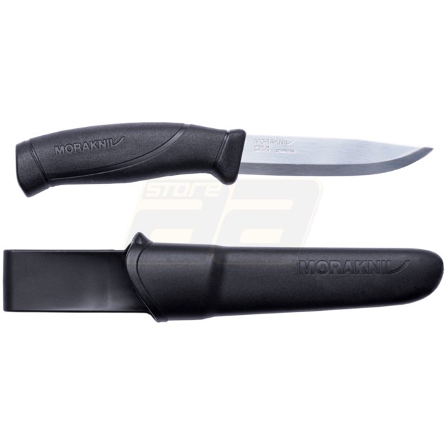 Morakniv Companion Black - Stainless Steel - Black. Premium quality stainless steel blade with a 104mm length, 2.5mm thickness. Durable and lightweight at 160g. The handle is made of Polypropylene providing a comfortable grip. Ideal for all outdoor activi