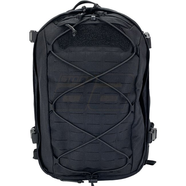 A large laser-cut surface permits the installation of MOLLE-system based pouches onto the backpack to further extend its capacity. Optionally, a shock cord zig-zags the entire back side creating a net to hold light objects such as a jacket. On the top it is held in place by a hook with quick detachable abilities and on the bottom the shock cord can be looped thru an eyelet and fastened by a cord stopper.