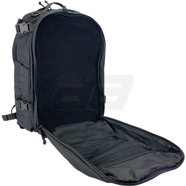 Spacious, compact, and tactical FastTrack Backpack in black. Made from Cordura 500D nylon with YKK zippers and Woojin hardware. Dimensions: 460 x 320 x 250 mm (HWD). Weight: 2130 g.