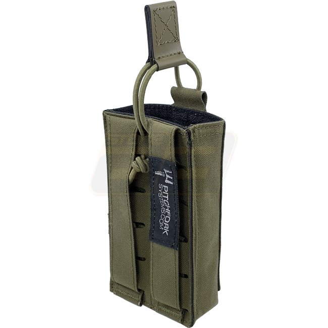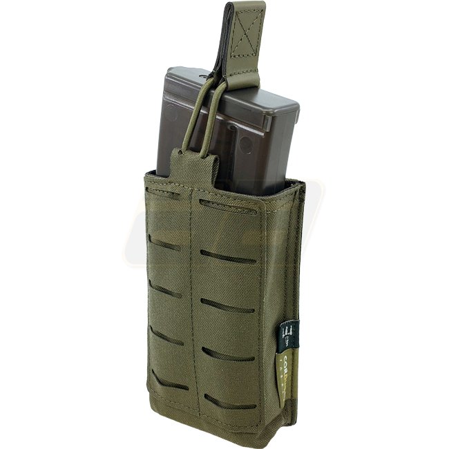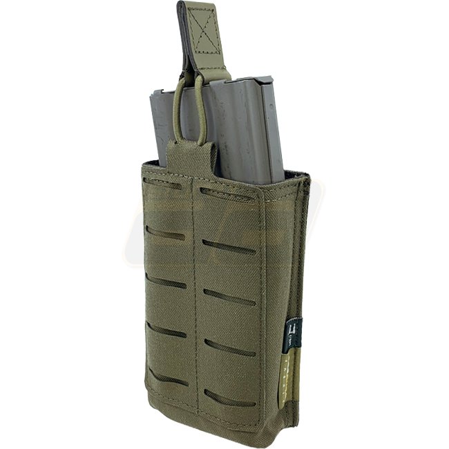 The Open Single Rifle Magazine Pouch can hold all common 5.56 / .223 rifle magazines, even SIG and AK47/74 magazines fit perfectly (G36 magazines do not fit). The highly resistant and slightly elastic Hypalon pull tab is adjustable in length. For a better grip, the inside of the pouch is lined with an anti-slip material. The front has a MOLLE system-based LaserCut surface, which can be used to mount additional pouches.