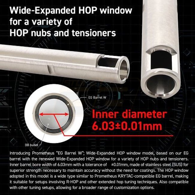 Prometheus Marui AEG 6.03mm EG WIDE Inner Barrel Stainless Steel 300mm - Extra large hop-up opening, 300mm length, 6.03mm inner diameter.