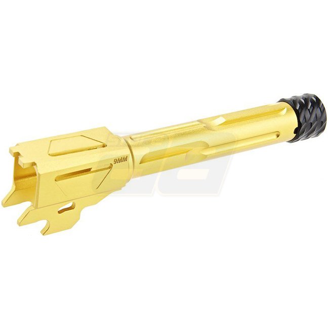 The RGW SIG Sauer M18 GBB KI Threaded Barrel in Gold color is made from high-quality aluminum. It features a 14mm CCW threading designed for improved stability and performance. Perfect for airsoft enthusiasts seeking durability and style.