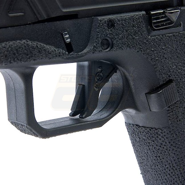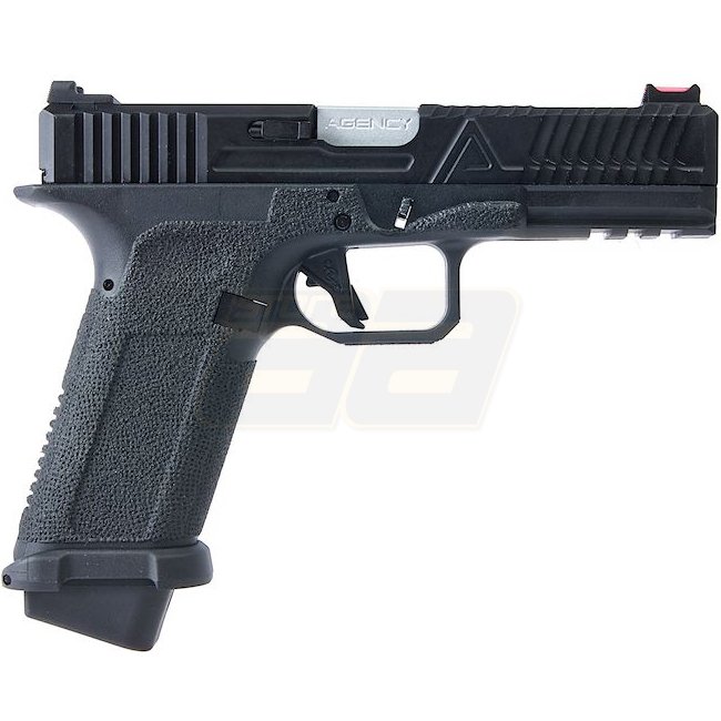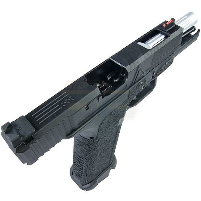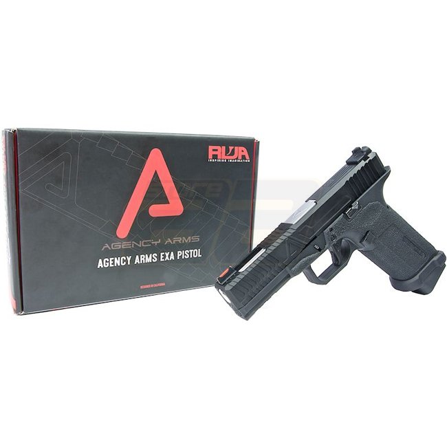RWA Agency Arms EXA Gas Blow Back Pistol - Black: Aluminum / Fiber reinforced polymer, 23 rounds, 195mm length, 670g weight, 97mm inner barrel, 300-320 FPS, Semi Auto, Shooting range 41.16-43.90m. Adjustable Hop Up. Includes Gun and Magazine.