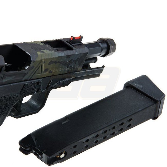 RWA Agency Arms EXA Gas Blow Back Pistol Ronin Black Barrel Edition - Black: High-quality gas blow back pistol with aluminum and fiber reinforced polymer construction, 23 round magazine capacity, and adjustable hop-up. Comes with a 97mm inner barrel, shoo