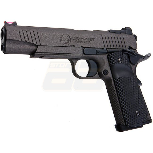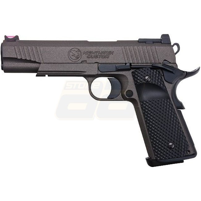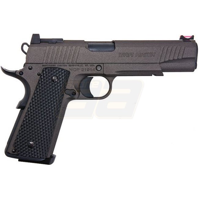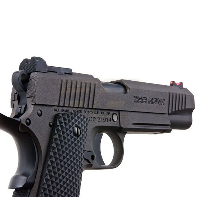 RWA Nighthawk Custom War Hawk Gas Blow Back Pistol with Cerakote finish in Grey. Metal construction, 21rd magazine, 250mm length, 950g weight. Muzzle velocity 280-300 FPS, shooting range up to 41m. Semi-auto shooting mode, adjustable hop-up. Package inclu