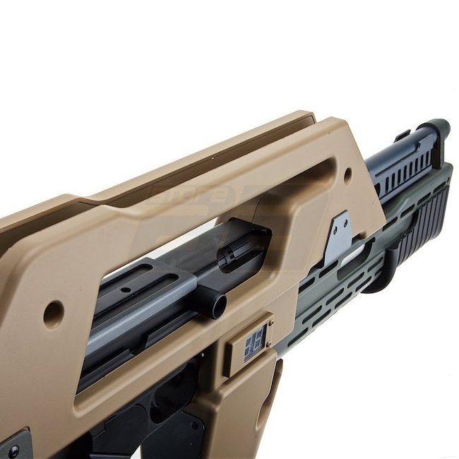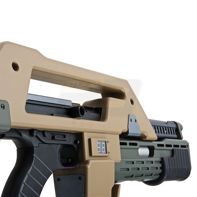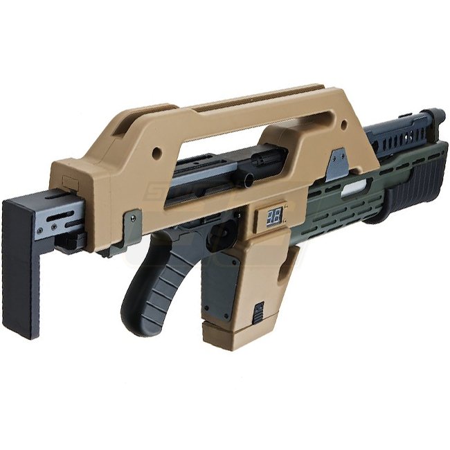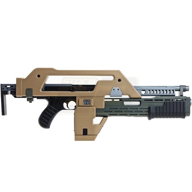 Snow Wolf M41A Aliens Pulse Rifle AEG - Tan: 22nd Century Colonial Marines replica from "Aliens" movie by James Cameron. Features digital cartridge counter, dummy grenade launcher, Version 6 gearbox, ABS plastic/metal parts, shooting modes Semi Auto & Ful