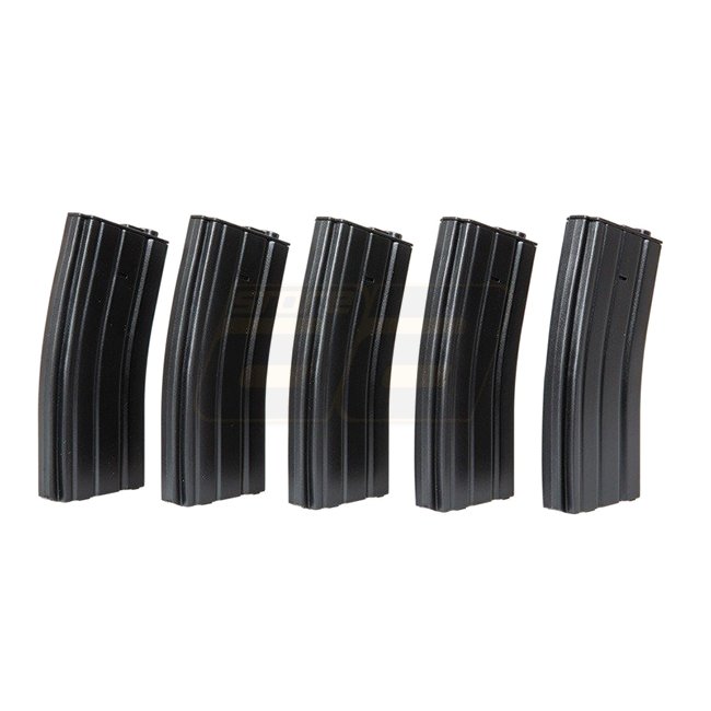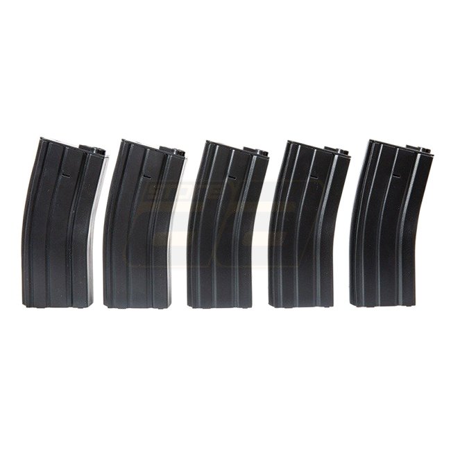 Specna Arms M4 100rds Polymer Magazine Set - Black. Material: Polymer, suitable for M4/M16 AEG, includes 5 magazines. Weighs 115g with a capacity of 100rds.