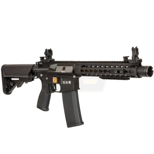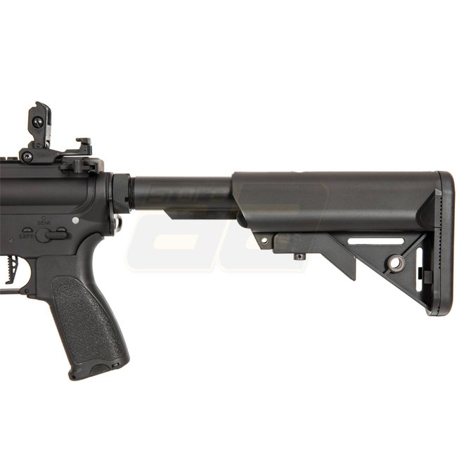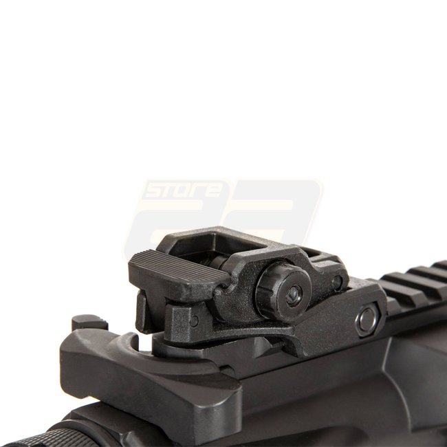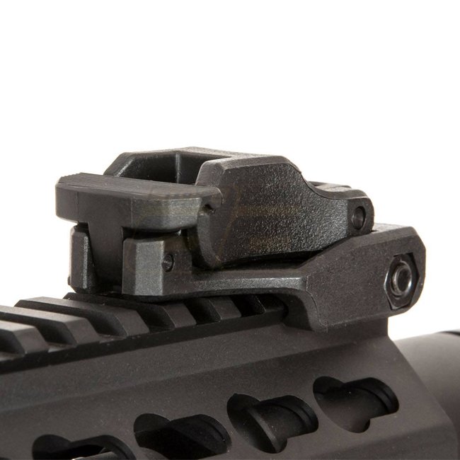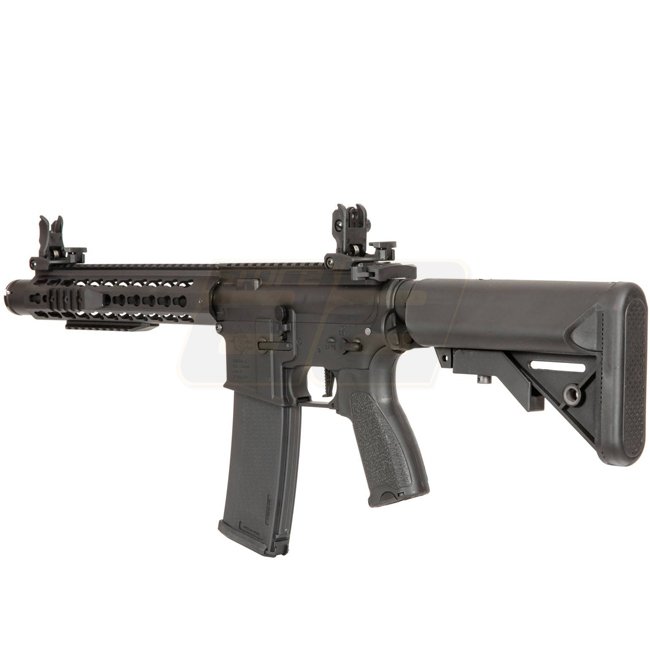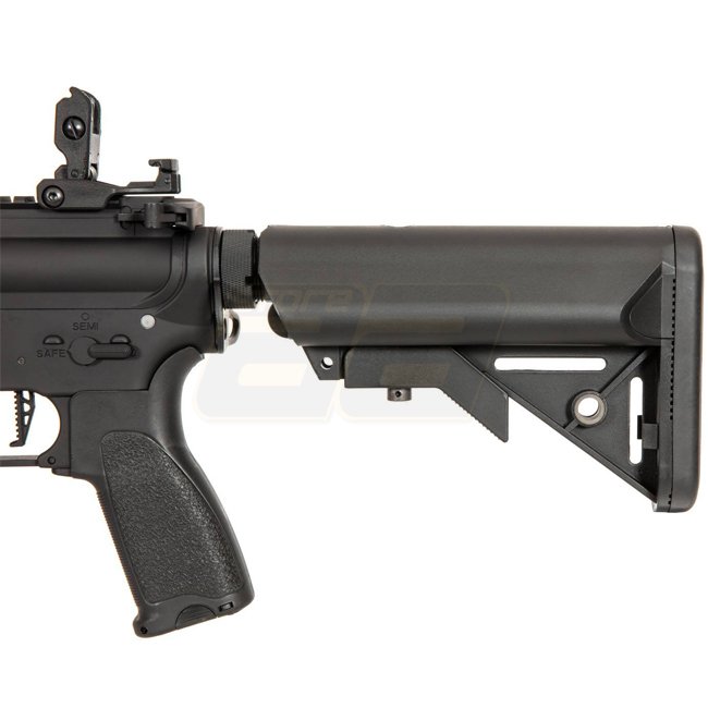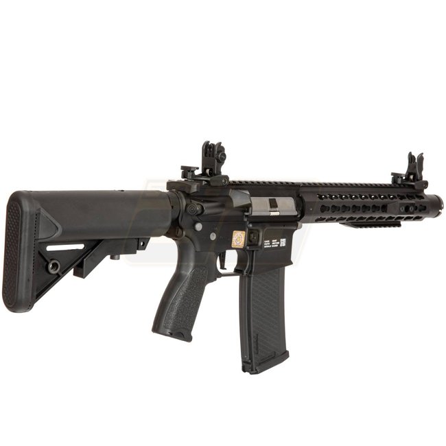 The Specna Arms RRA SA-E07 EDGE 2.0 AEG in Black features a metal gearbox, MOSFET technology, long type motor, and a durable construction made of metal with polymer stock and pistol grip. This AEG has a magazine capacity of 125 rounds, a length of 690-775