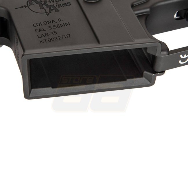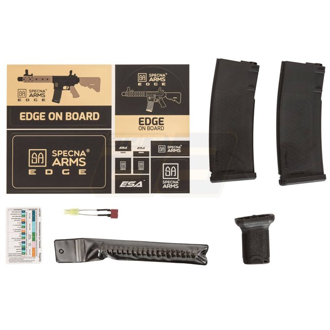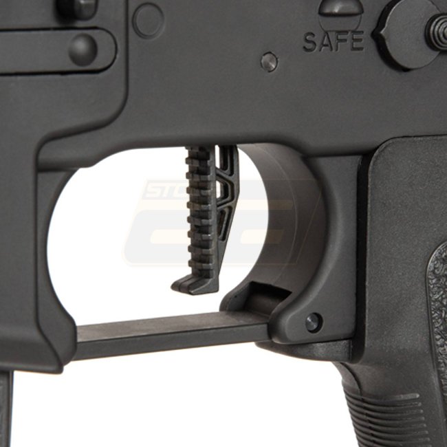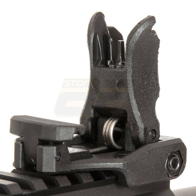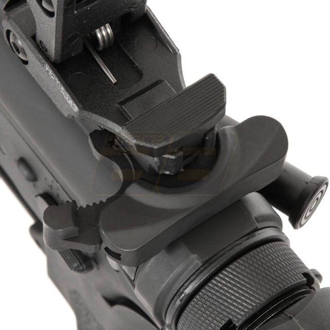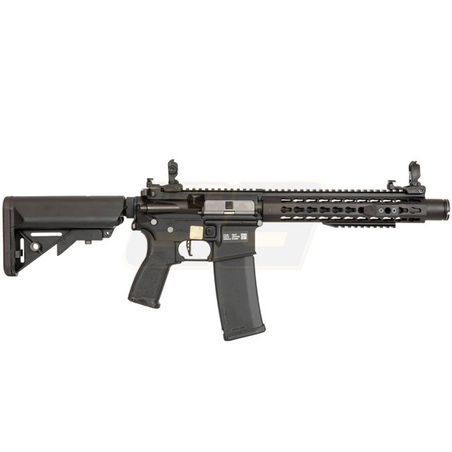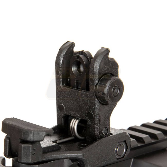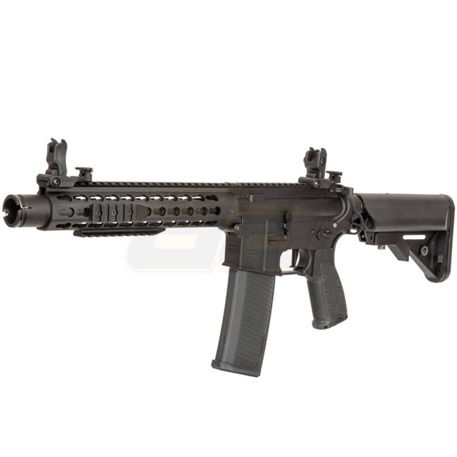The Specna Arms RRA SA-E07 EDGE 2.0 AEG in Black features a metal gearbox, MOSFET technology, long type motor, and a durable construction made of metal with polymer stock and pistol grip. This AEG has a magazine capacity of 125 rounds, a length of 690-775