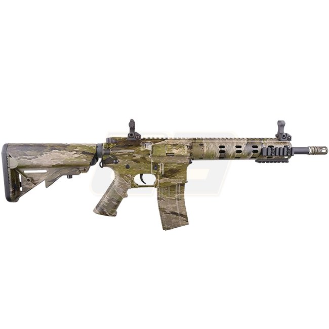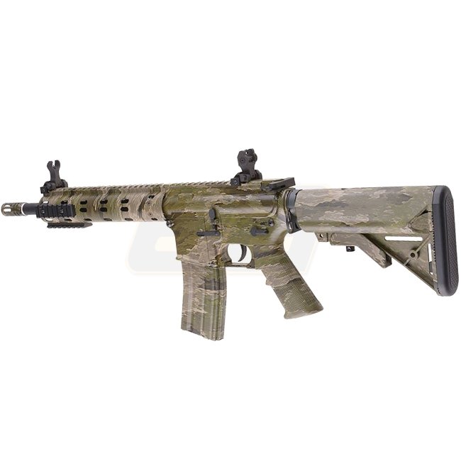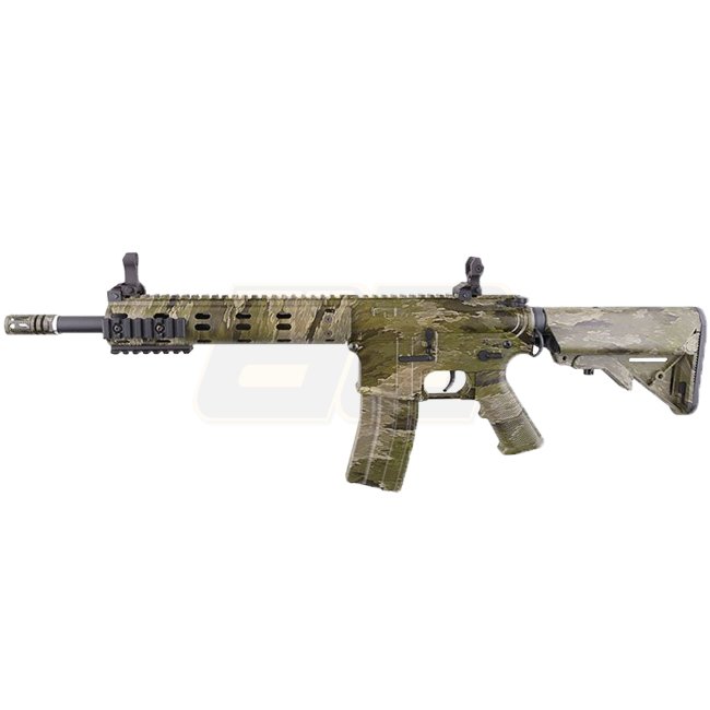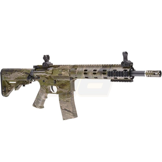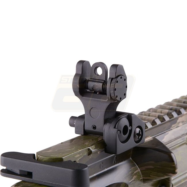 The Specna Arms SA-A08 AEG - A-TACS IX is a powerful airsoft rifle with semi-auto & full auto shooting mode, adjustable hop-up, and a muzzle velocity of 410-430 FPS. It comes with a long-type motor and a metal gearbox, providing durability and reliability