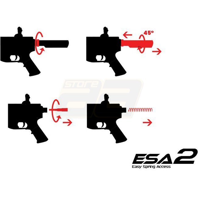 The models of the Specna Arms EDGE 2.0 E-series come with a nano-coated metal body. Inside, a robust "ORION“ gearbox ensures reliability and flexibility, as it is equipped with the "ESA2" quick spring change system. This way the performance can be changed in just a few simple steps. Furthermore, in the gearbox is already a GATE ASTER mosfet installed. The built-in parts allow the use of an M140 spring. The 6.03mm inner barrel combined with a Flat-Hop Up ensures the necessary precision. In addition to the factory built-in spring, Specna Arms supplies an additional M90 spring, which can reduce the AEG's performance to approx. 310 FPS.