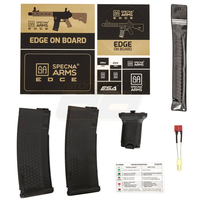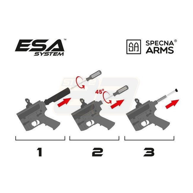 The models of the Specna Arms EDGE E-series come with a nano-coated metal body. Inside, a robust "ORION“ gearbox ensures reliability and flexibility, as it is equipped with the "ESA" quick spring change system. This way the performance can be changed in just a few simple steps. Furthermore, in the gearbox is already a GATE X-ASR mosfet installed. The built-in parts allow the use of springs of different strengths (up to M140). The 6.03mm inner barrel combined with a rotary precision HopUp Unit ensures the necessary precision. In addition to the factory built-in spring, Specna Arms supplies an additional M90 spring, which can reduce the AEG's performance to approx. 310 FPS.
