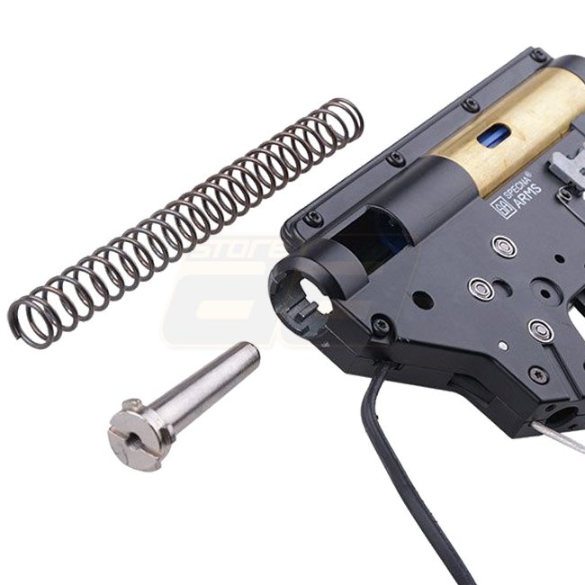 Specna Arms SA-K05 AEG - Black: A high-quality, versatile airsoft gun with metal gearbox and long type motor, featuring adjustable hop-up and semi-auto/full-auto shooting modes. Package includes gun, magazine, and M90 replacement spring.