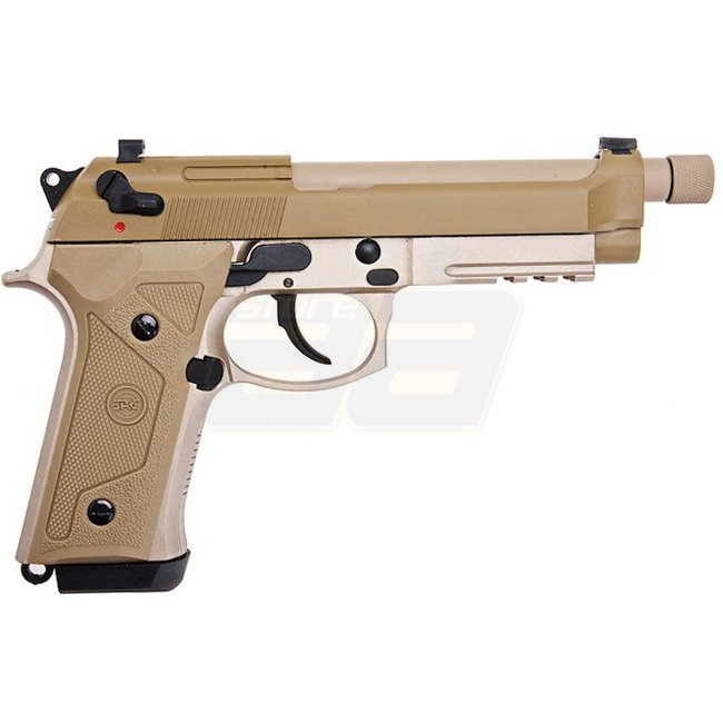 High-quality SRC M9A3 SR-92 A3 Gas Blow Back Pistol - Desert with metal and polymer construction, 25-round magazine capacity, 230mm length, 916g weight, 109mm inner barrel length, 320-340 FPS muzzle velocity, Semi Auto shooting mode, shooting range of 43.