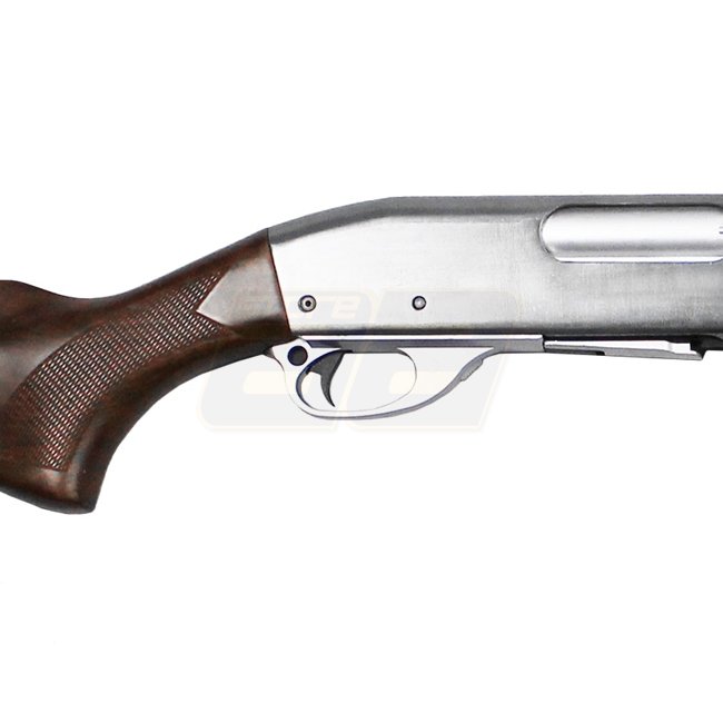 S&T M870 Standard Shotgun - Silver ???? Premium quality shotgun made of metal with handguard & stock wood. Features adjustable hop-up, single shot shooting mode, and shoots at 380-400 FPS. Perfect for long-range shooting enthusiasts. Magazine capacity of