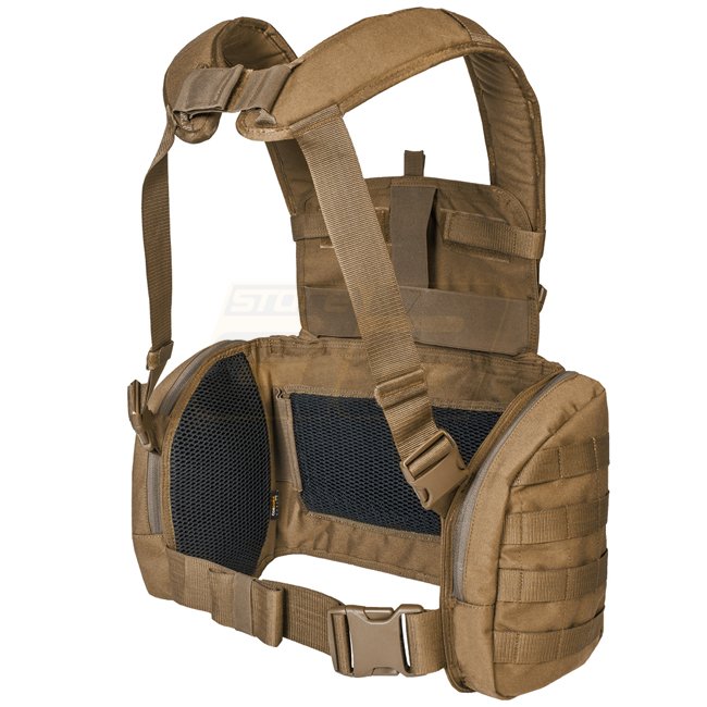 High-utility Tasmanian Tiger Chest Rig MK2 in Coyote color, featuring adjustable padded shoulder straps, various zipper and Velcro pockets, two side utility pouches, fold-out pen/flashlight holder, and four magazine pouches for G36, SIG, AUG, M4, and M16.