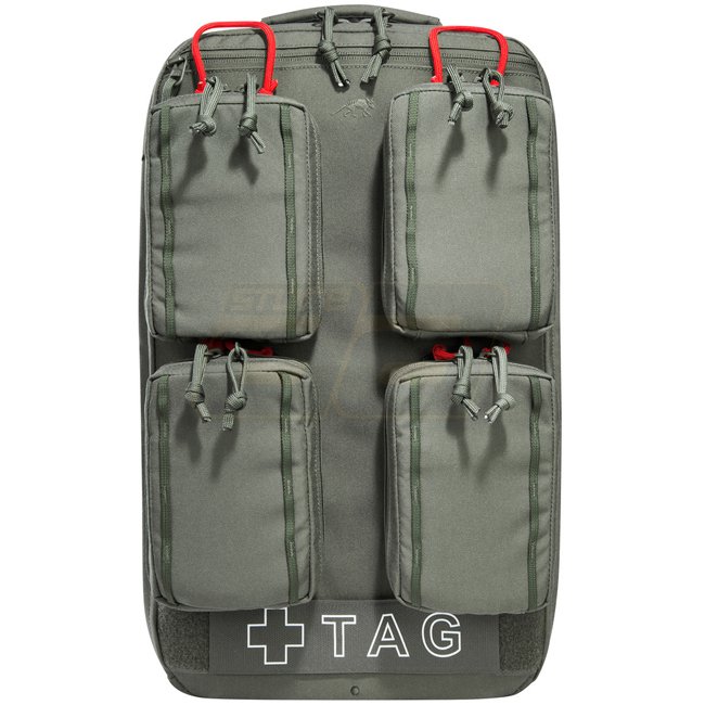 The Tasmanian Tiger Medic Mascal Pack IRR in Stone Grey Olive is designed for initial treatment of injured persons in mass casualty situations. Equipped with four IFAK pouches for quick access, laser-cut MOLLE system on sides, and stocked with emergency s