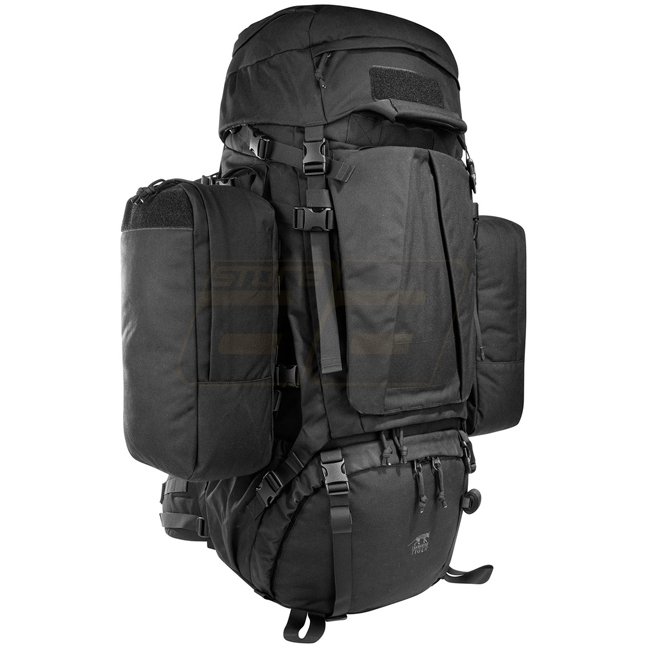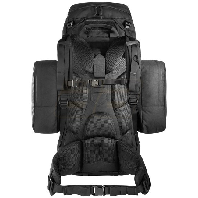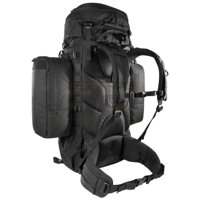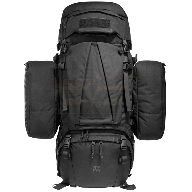 Rugged Tasmanian Tiger Mil OPS Pack 80 & 24 - Black with adjustable V2 carrying system for heavy loads. Large compartment, side pockets, lacing system, and helmet holder. MOLLE system on front and sides.