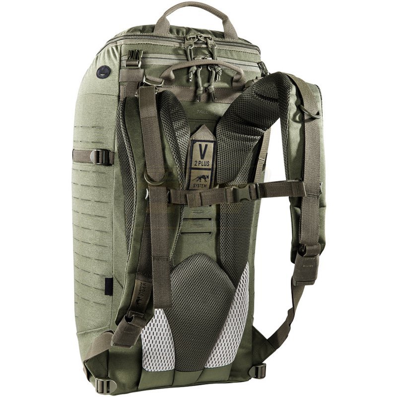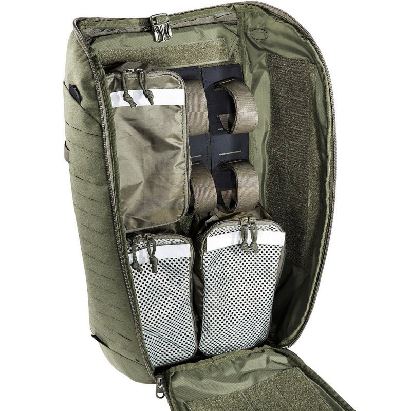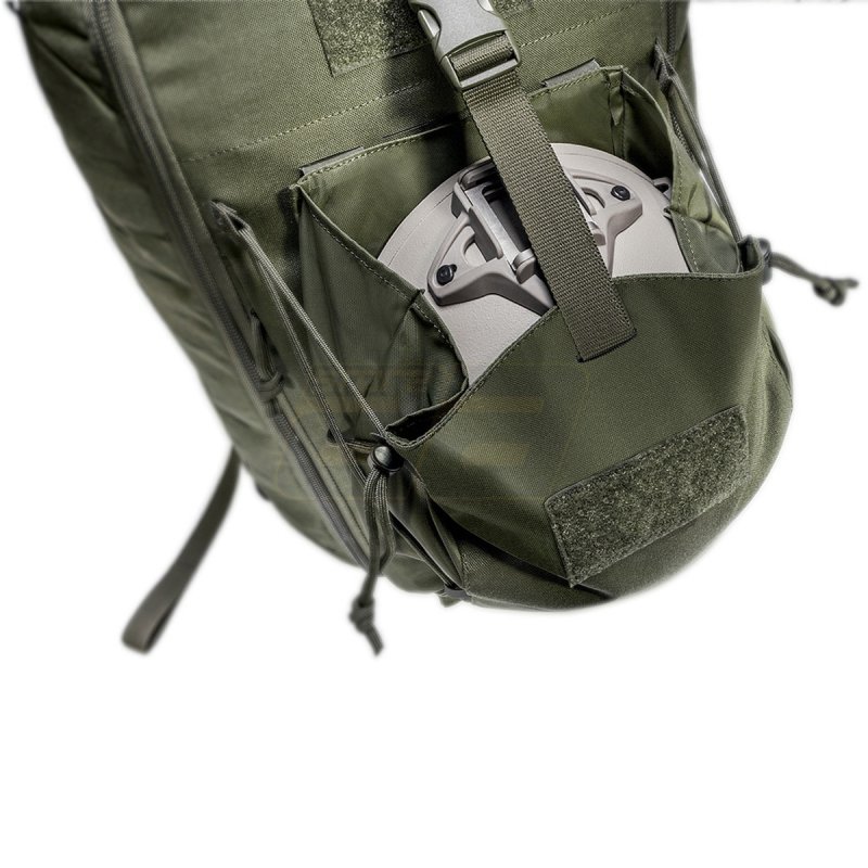 Modular, universal deployment backpack with removable lid. The front opening of this deployment backpack can be fully raised, and the lid can be height-adjusted or removed. The backpack has a lid compartment and has laser-cut MOLLE on the sides and on the front. It also has a removable folded pocket on the front. The interior has hook-and-loop panel for customizing the configuration. The removable hip belt can also be used separately as a Warrior Belt. Includes three attached accessory pouches and an attached weapon holster.