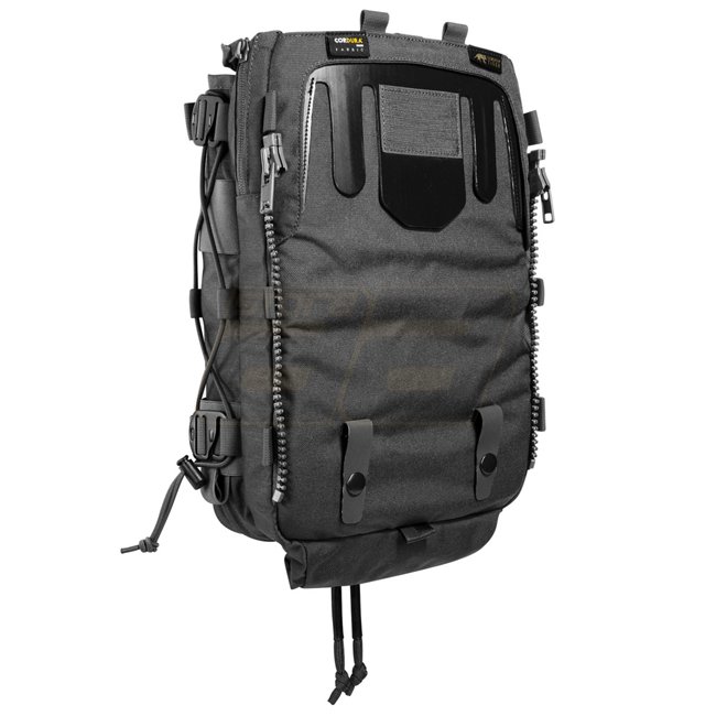 The TT Tool Pack ZP IRR is designed for the TT Plate Carrier QR LC ZP IRR, the attachment is via side zippers. The pack can also be mounted on other plate carriers on the market with the appropriate zipper length and width. In addition, In addition, the included zippered MOLLE strip allows it to be attached to plate carriers with a MOLLE scheme. An additional adapter is included for attachment to classic MOLLE straps. The fold-out main compartment is suitable for bolt cutters up to a length of 80 cm, the fold-out front compartment accommodates various entry tools, and the hooked-in tubes can also be removed. In addition, the pack has insertion options for breach pens on the sides. On the front is MOLLE in laser-cut design, the elastic side compression can be removed.