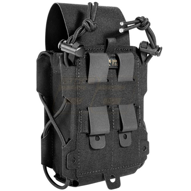 Compact Tasmanian Tiger Universal Pouch M in sleek black, ideal for magazines, GPS, radios, and water bottles. Made with durable CORDURA® 700D / T-Stretch material. Weighs only 100g, with dimensions of 17 x 10 x 7cm.