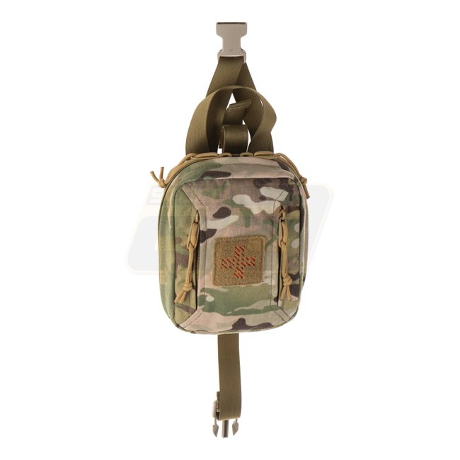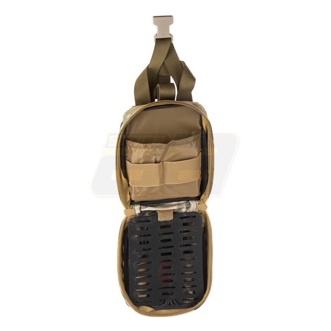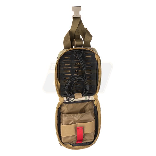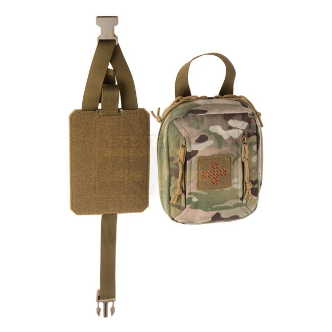 The AZ2 is a rip-away first aid pouch designed for quick access and secure attachment. The anchor panel attaches to load-carrying equipment using the MOLLE-compatible system, while the pouch itself is secured with Velcro and an additional strap with a fastex buckle. This setup ensures stable attachment and one-handed removal in emergencies.