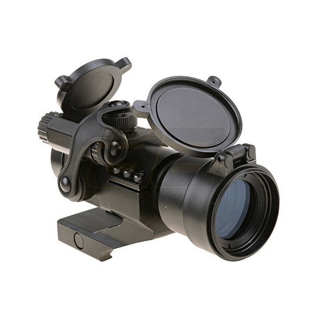 Theta Optics Battle Red Dot Sight & Cantilever Mount - Black. Magnification: 1x. Lens diameter: 30mm. Illumination: Red & Green. Reticle: Dot, adjustable. Batteries: 2x LR44 (incl.). Mount: 20mm. Length: 130mm.