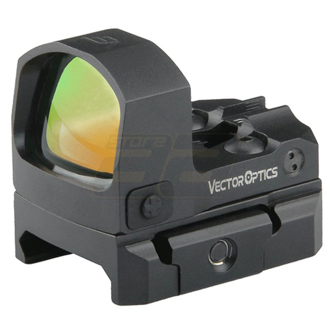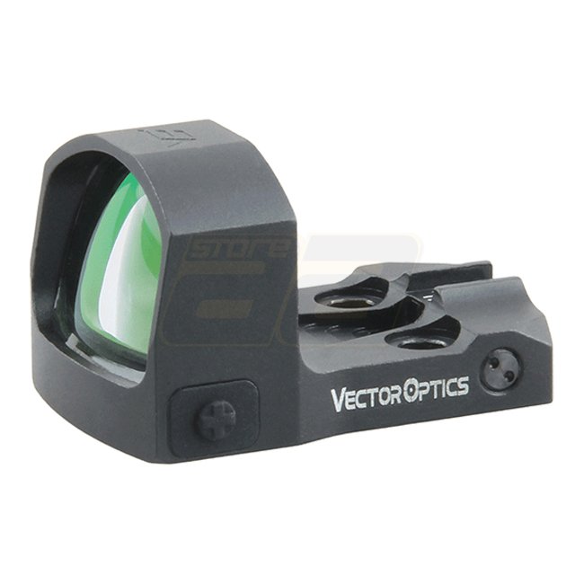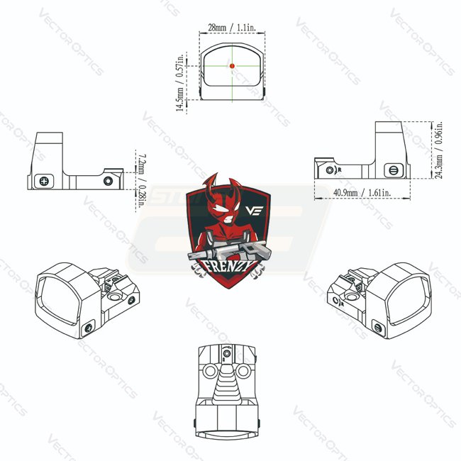 Vector Optics Frenzy-S 1x17x24 MOS Multi Reticle - Black: 1x magnification, unlimited eye relief, 3 MOA Dot & 40 MOA Circle, 8 + 2 Nightvision brightness levels. Max. elevation and windage adjustment of 45 MOA each. Parallax unlimited. Includes 1x CR2032