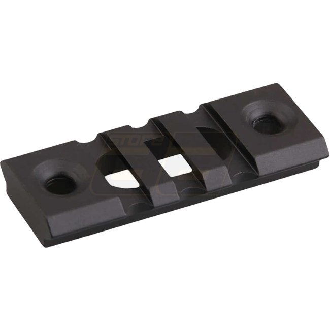 This Vector Optics SCRAAM-22 rail section fits into M-series KeyMod handguards, providing a 2-inch length of Picatinny surface. Machined from high-strength aluminum alloy with a durable matte-black finish, it features KeyMod slots on the sides and bottom for accessory mounting. Includes installation tools. Overall length: 55 mm; 40 mm between screw holes; weight: 20 g.