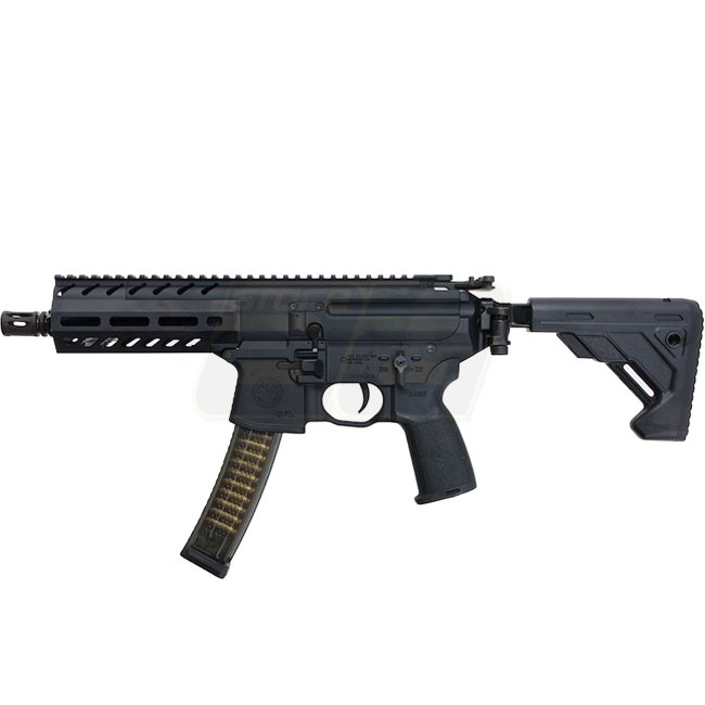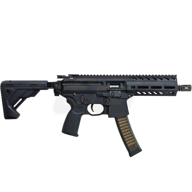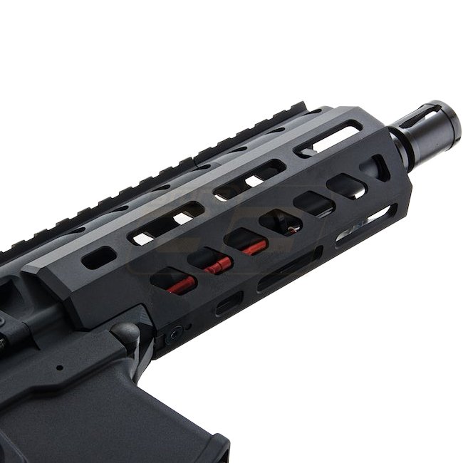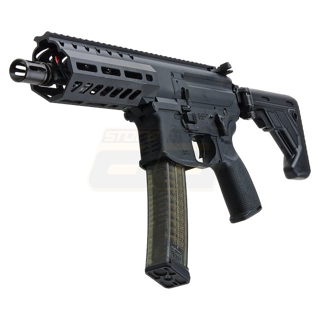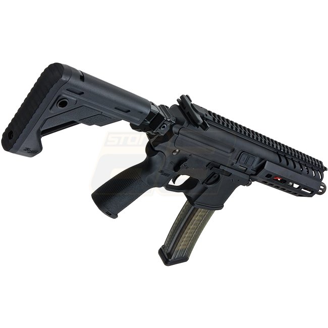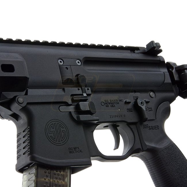 VFC Sig Sauer MPX AEG - Black features Version 2.1 Gearbox, MOSFET, Long Type Motor, Metal / stock & polymer grips, 100rd magazine, 635mm length, 2540g weight, 14mm CCW thread, 340-360 FPS velocity, Semi and Full Auto, 46.65-49.39m range, Adjustable Hop U