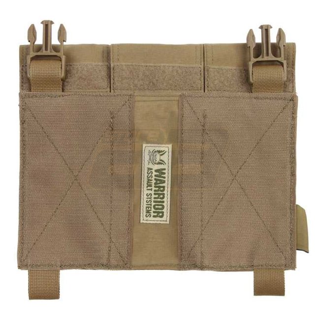 The DFP-TM4 is a removable MOLLE front panel designed to attach to the front of Warrior's Recon Carrier (RPC) via two vertical SQM clips. This panel features triple 5.56mm M4 pouches, accommodating a total of six 5.56mm x 45mm M4-style magazines, including P Mags, SA80, H&K 416, Diemaco, and Sig 516. The pouches have roll-back lids that can be secured in the open position for rapid magazine changes.