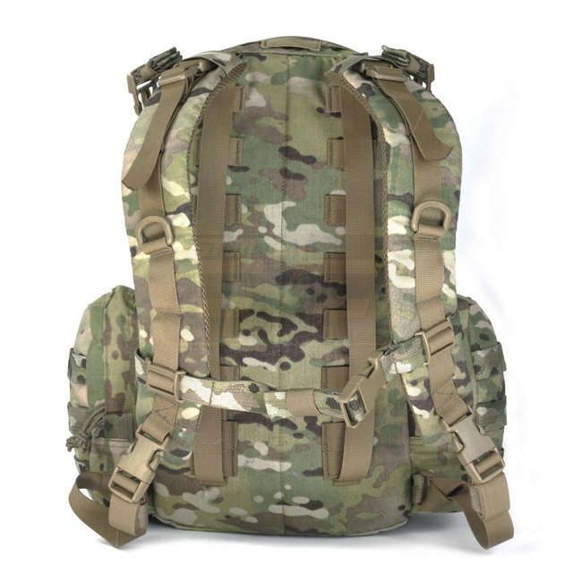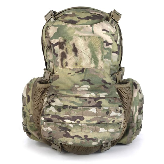 The Elite Ops Helmet Cargo Pack Large by Warrior Assault Systems is a high-capacity tactical backpack designed for short-duration missions. It features a central compartment suitable for general storage, accessible via a heavy-duty zipper. Inside, a separate sleeve accommodates a 3-liter hydration bladder (not included). Two external side pockets offer additional storage for small items. A fully adjustable folding pouch on the exterior is designed to carry a combat helmet, jacket, or clothing. Inside this pouch, three sewn elasticated pockets can hold up to six magazines or a combination of personal medical kit and radio. The pack can be worn with two padded removable shoulder straps or attached to the back of any MOLLE-compatible carrier, such as the DCS or RPC.