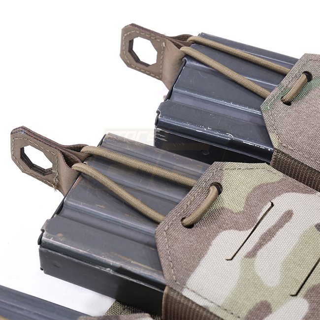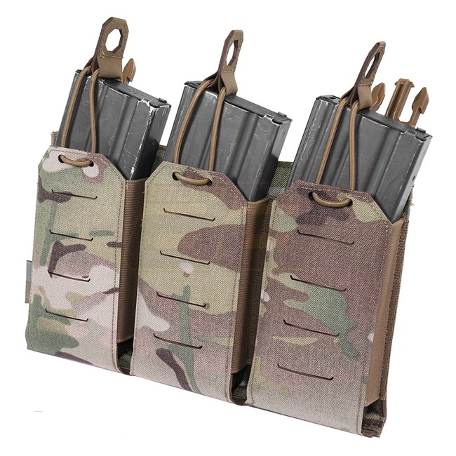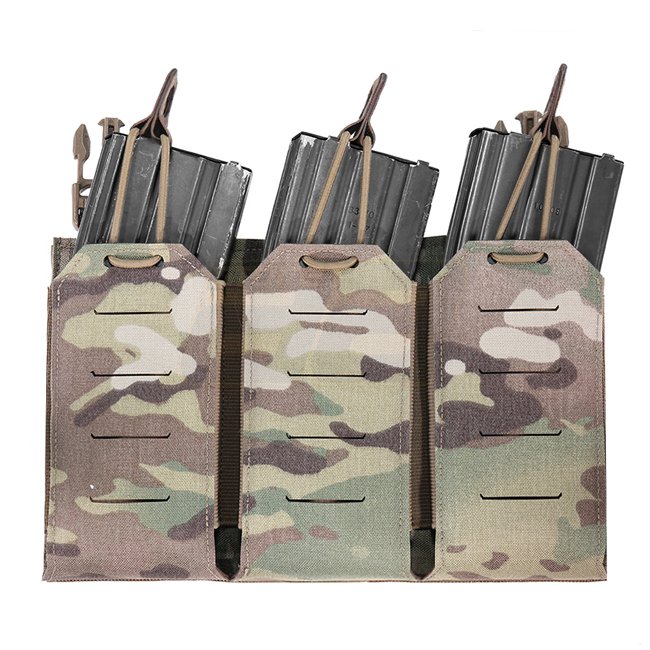 The Warrior Laser Cut Triple Bungee 5.56 Magazine Pouch is a detachable front panel designed to hold three 5.56 mm magazines. It attaches securely to the front of Warrior's Laser Cut LPC Plate Carrier. Elastic bungee cords and a Hypalon lining provide magazine retention even without additional securing measures.