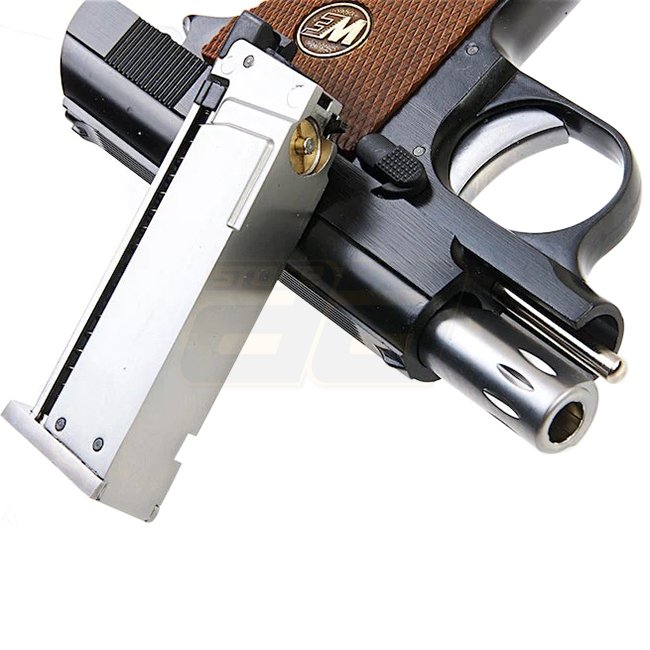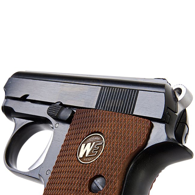 WE CT25 Gas Blow Back Pistol - Black, metal and polymer construction, 7 round magazine capacity, compact size of 150mm, lightweight at 308g, semi-auto shooting mode, adjustable hop-up, package includes gun and magazine.