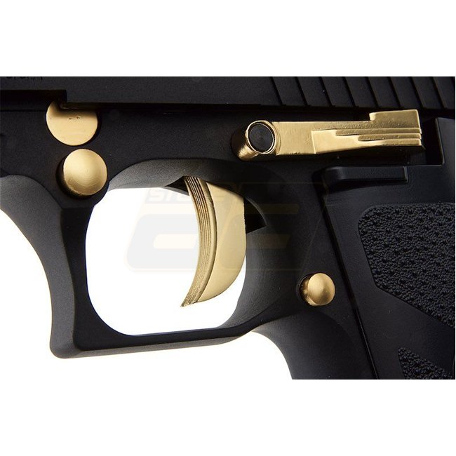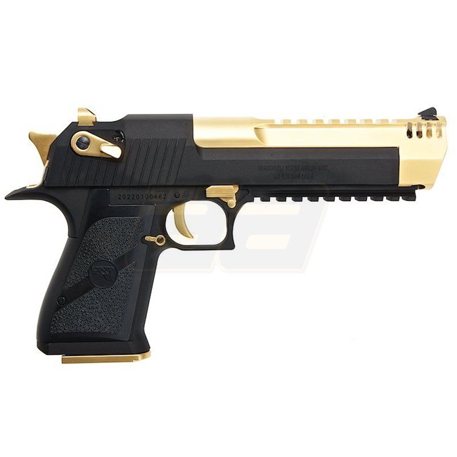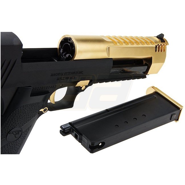 The WE Desert Eagle L6 .50 AE Gas Blow Back Pistol in Black / Gold is a powerful and stylish airsoft gun perfect for semi-auto shooting. Metal and polymer materials, 27-round magazine capacity, 1360g weight, 350-370 FPS muzzle velocity, adjustable hop-up,