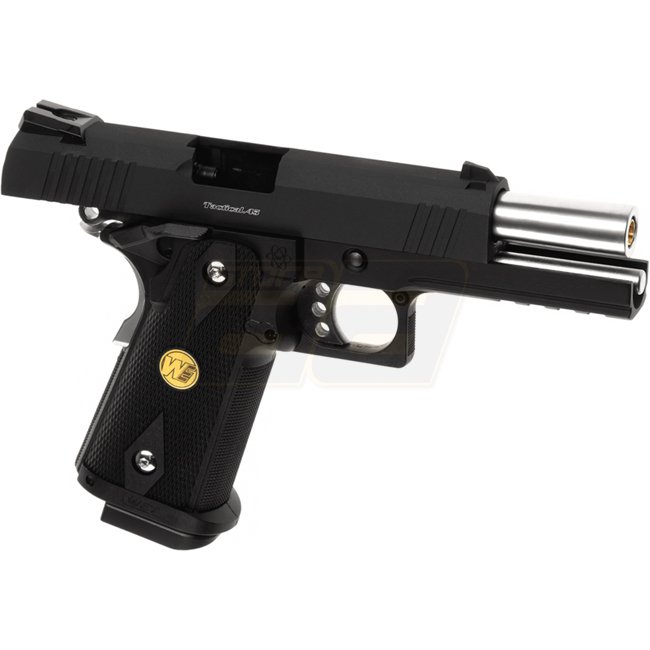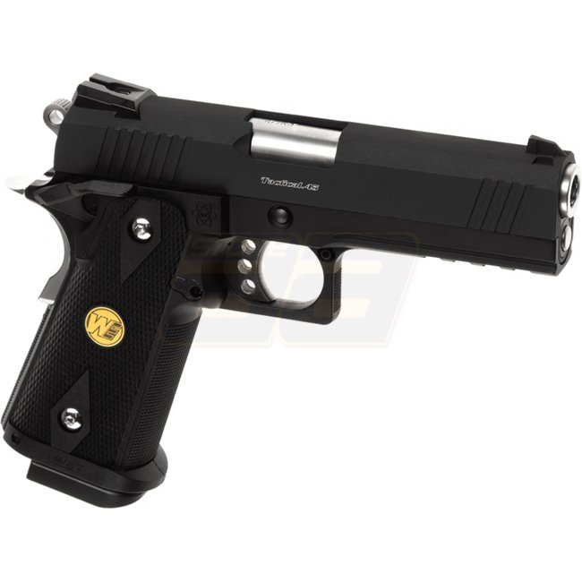 WE Hi-Capa 4.3 OPS Gas Blow Back Pistol - Black. Metal and polymer construction, 28-round magazine, 205mm length, 940g weight. Inner barrel length of 90mm, muzzle velocity of 300-320 FPS, semi-auto shooting mode, adjustable hop-up. Package includes gun an