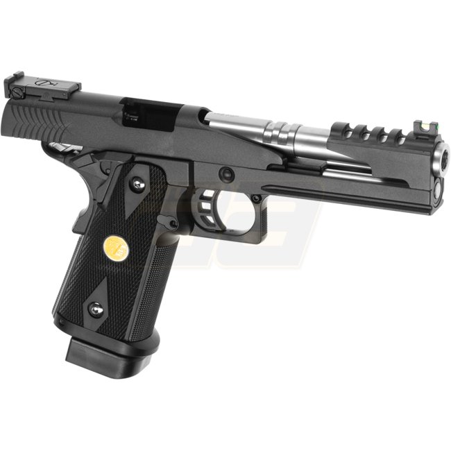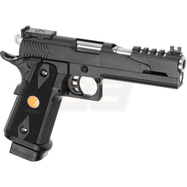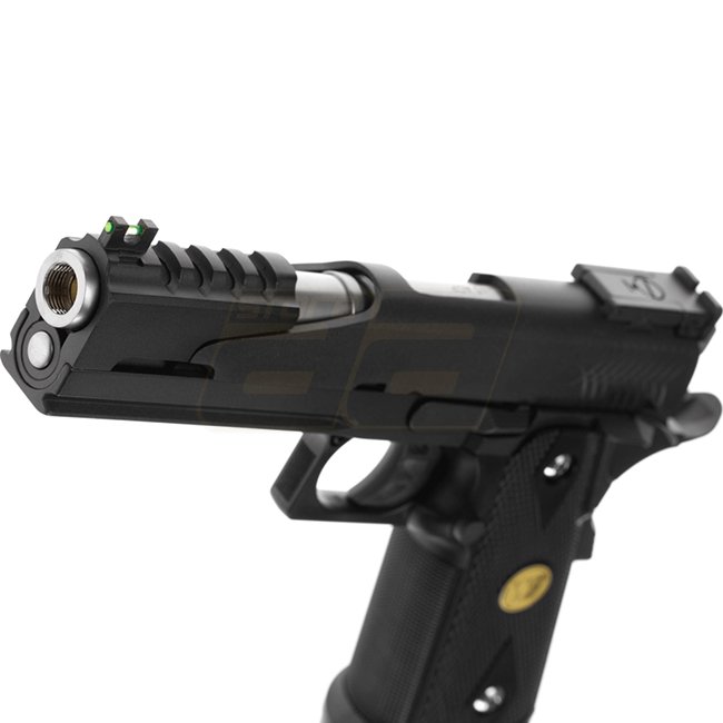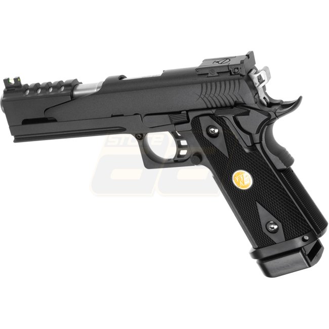 WE Hi-Capa 5.1 Dragon Co2 Blow Back Pistol - Black, metal body with plastic grip cover, 31-round magazine capacity, 220mm length, 1100g weight, 110mm inner barrel, 330-350 FPS muzzle velocity, Semi Auto shooting mode, adjustable hop-up. Package includes g