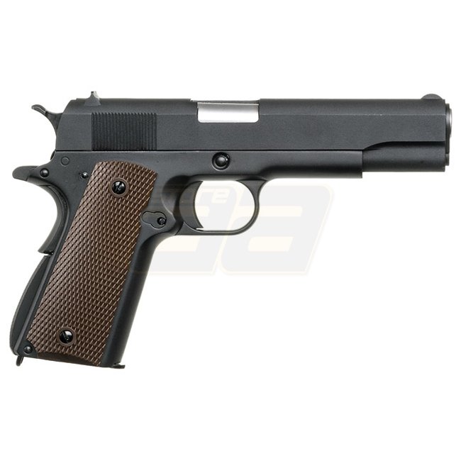 WE M1911 Co2 Blow Back Pistol - Black. Metal / plastic grip. Magazine capacity: 15. Length: 218mm. Weight: 880g. Adjustable hop up. Semi Auto shooting mode. Package includes gun and magazine.