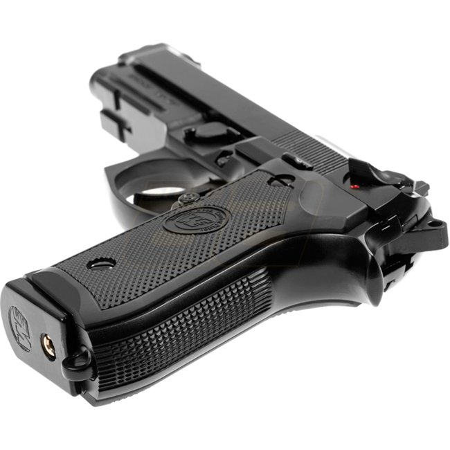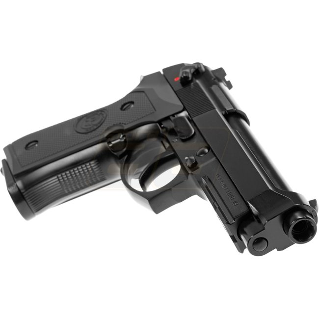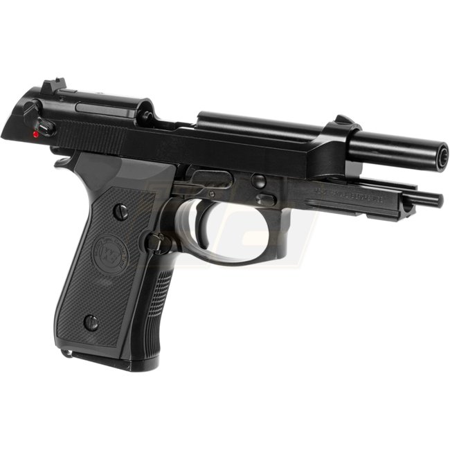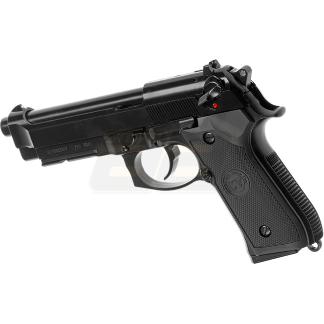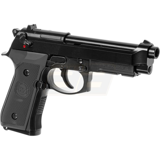 The WE M9A1 V2 Gas Blow Back Pistol in black color is a high-quality airsoft gun with metal and polymer construction. It features a 25-round magazine capacity, 215mm length, 890g weight, and a muzzle velocity of 320-340 FPS. This semi-automatic pistol has